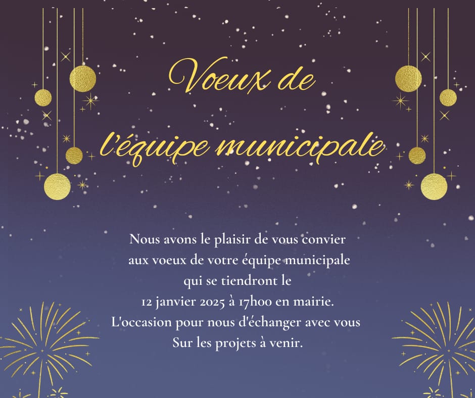 Nous avons le plaisir de vous inviter à assister aux vœux de votre équipe municipale, qui auront lieu le 12 janvier 2025 à 17h00 en mairie.